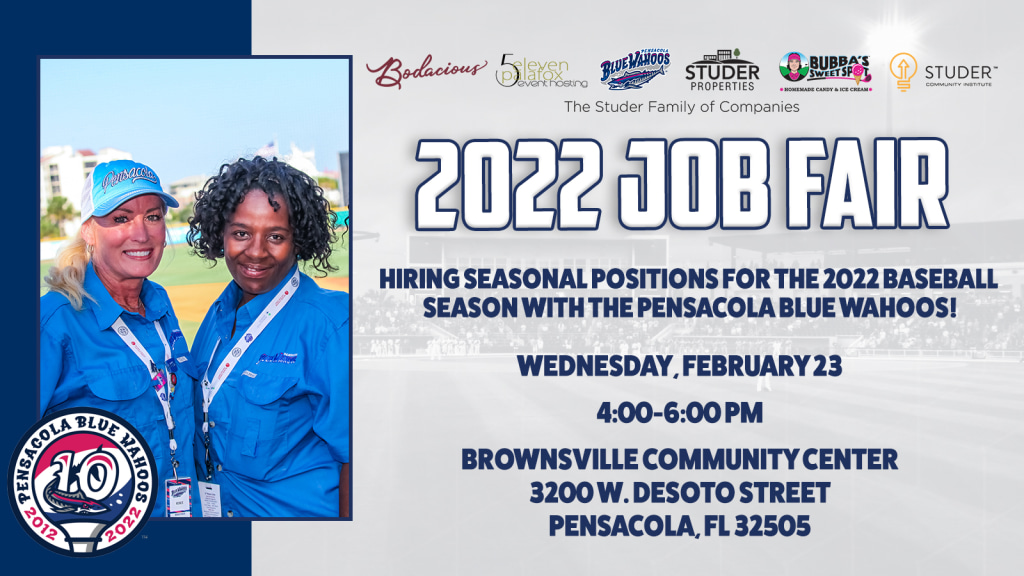The Blue Wahoos are hiring for the 2022 baseball season and will hold a job fair on Wednesday, February 23 at the Brownsville Community Center in Pensacola to seek candidates interested in available positions for the upcoming season. Candidates can interview on-site for positions from 4:00-6:00 PM at the Community