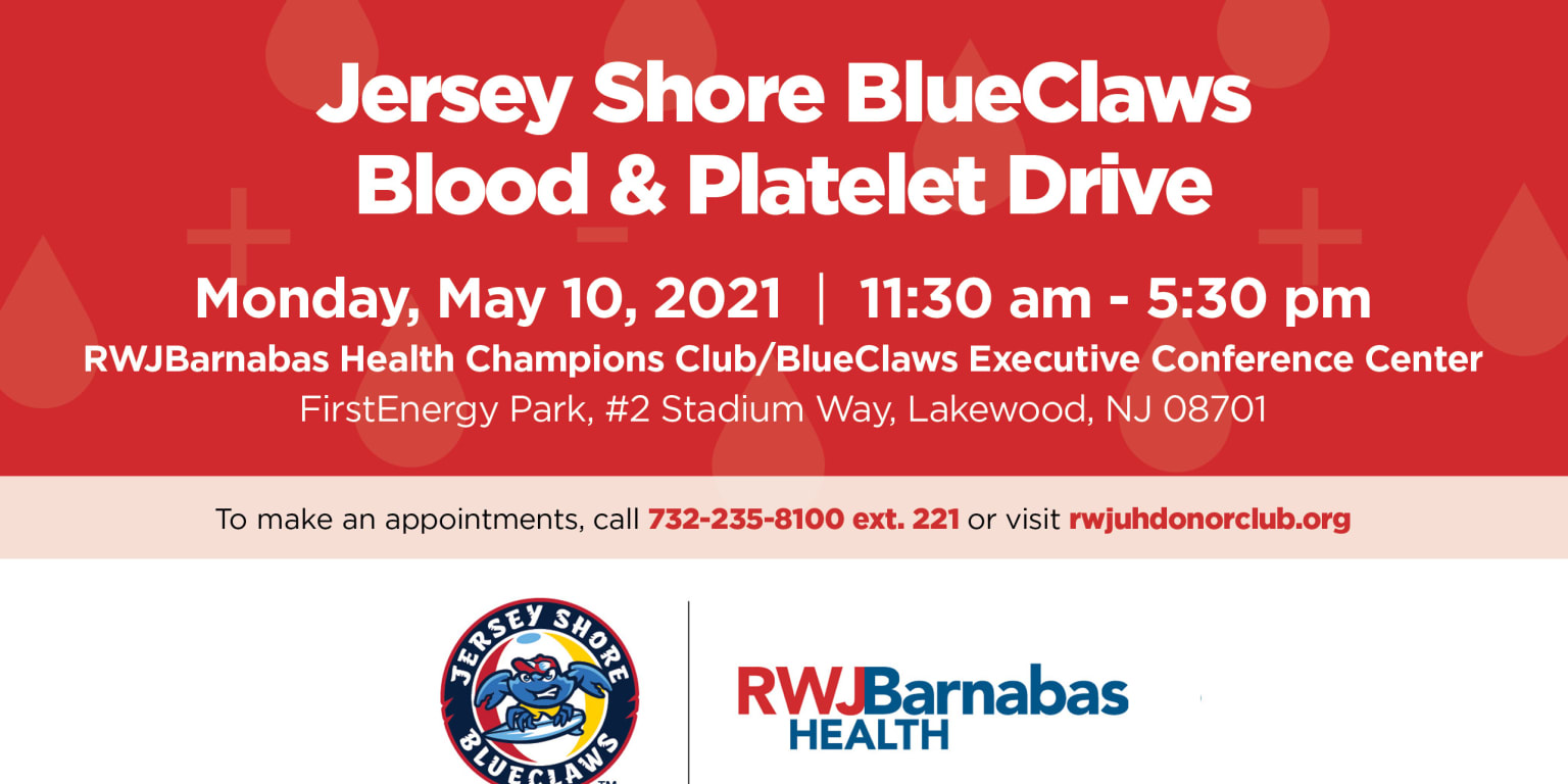 JERSEY SHORE, NJ – The BlueClaws and RWJBarnabas Health will partner on a special blood drive to be held at FirstEnergy Park on Monday, May 10th from 11:30 am – 5:30 pm.