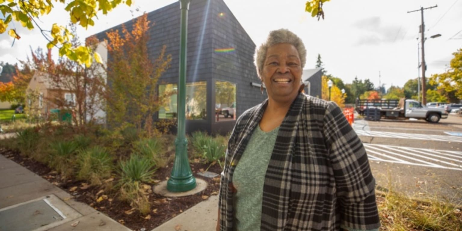 In the 1940s, exclusionary laws prevented Black people from buying or renting within city limits. Because of this, her family lived in the “Ferry Street Village” community, near present-day Alton Baker Park. When she was three years old, the Lane County Commissioners ordered that the neighborhood where she and her family lived be bulldozed so that the Ferry Street Bridge could be placed there. Her family was displaced and lived many years out West 11th.