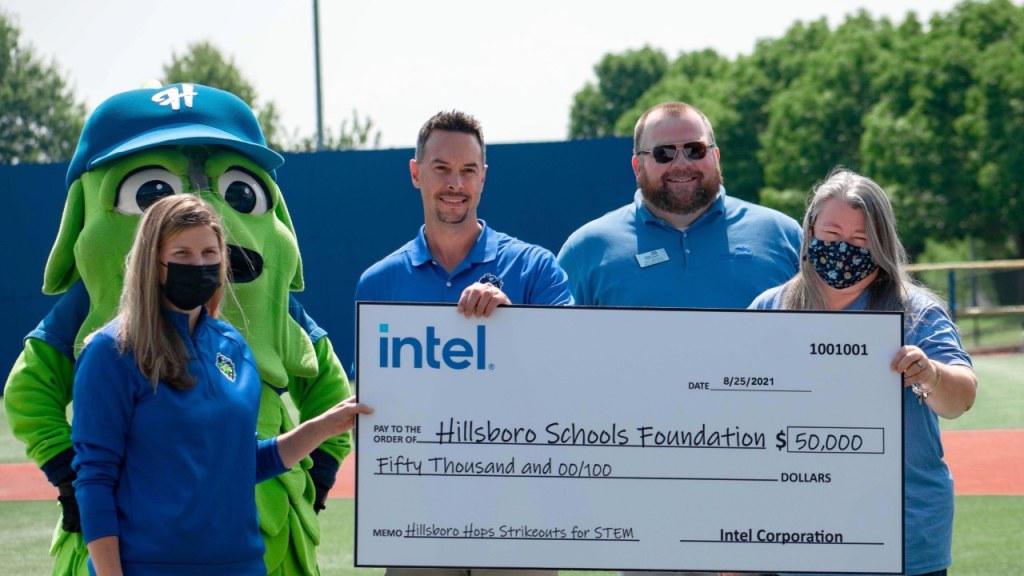 HILLSBORO, OR (August 27, 2021) – As part of a partnership between the Hillsboro Hops (@HillsboroHops) and Intel, the Oregon-based, microprocessor manufacturer is donating a total of $50,000 to fund future STEM opportunities for the children of Hillsboro in support of the Hillsboro Schools Foundations new Imagina tu Aventura program.