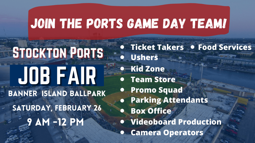 STOCKTON, Calif. –The Stockton Ports, in conjunction with Professional Sports Catering, are excited to announce the upcoming Ports Job Fair at Banner Island Ballpark on Saturday, February 26, 2022 from 9 AM – 12 PM. The Ports and Professional Sports Catering will be hiring for all positions and candidates that are interested in working for the Ports this season are highly encouraged to show up for the Ports Job Fair on Feb. 26.